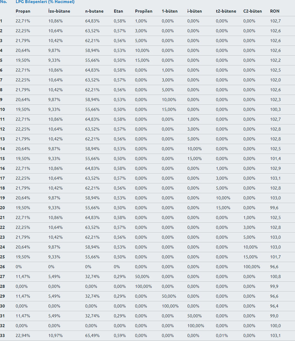 Oktan ölçümlerinde kullanılacak referans yakıtlar TÜBİTAK MAM Enerji Enstitüsü Yakıt Analizleri Laboratuvarı tarafından hazırlanmış ve oktan motorunda ölçülerek doğrulanmıştır. Oktan ölçümlerinde kullanılmak üzere farklı bileşenleri olan LPG karışımı hazırlanmıştır. Hazırlanan 14 farklı LPG karışımlarında 2 litrelik numune tüplerine Körfez 4. Noteri huzurunda 3’er adet eş numune alınmıştır. Numune alımı sonrasında tüpler noter tarafından mühürlenmiştir. Alınan eş numunelerden 1 set numune ODTÜ Petrol Araştırma Laboratuvarı’ na LPG kompozisyon analizi için gönderilmiştir. ODTÜ PAL tarafından hazırlanan ve testlerde kullanılacak LPG’lerin kompozisyonlarını gösteren raporlar ekte yer almaktadır. Alınan eş numunelerden diğer 1 set numune TÜBİTAK MAM Enerji Enstitüsü Yakıt Analizleri Laboratuvarı’na RON ölçümü için gönderilmiştir. Son 1 set numune ise şahit numune olarak bırakılmıştır.Numuneler ODTÜ PAL’e gönderilerek kompozisyonları ölçülmüştür.